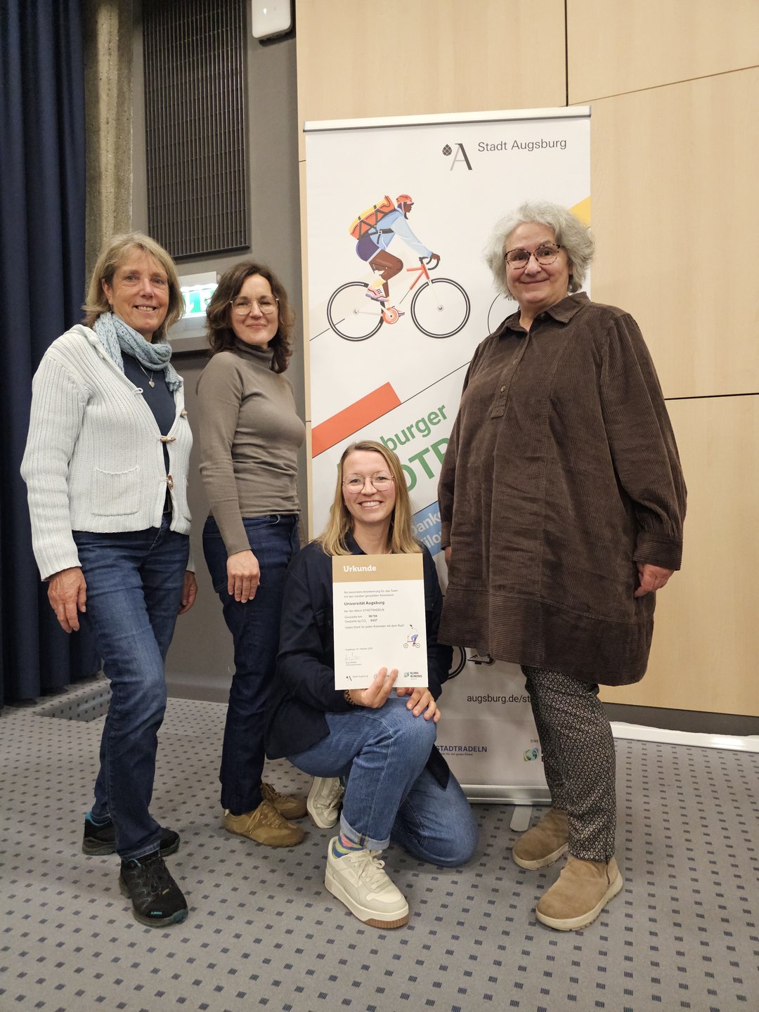 Die Universität Augsburg hat sich beim Stadtradeln 2025 an die Spitze gesetzt: In 20 Unterteams waren die insgesamt 281 aktiven Radelnden organisiert. Mit ihren 58.759 geradelten Kilometern trugen sie dazu bei, 9.636,5 kg CO₂ zu vermeiden. Damit wurde auch deutlich, dass sich Beschäftigte und Studierende beim Thema Mobilität fürs Klima engagieren. Bei der Abschlussveranstaltung des diesjährigen Stadtradelns am 16. Oktober 2025 wurden die Sieger und Siegerinnen in verschiedenen Kategorien ausgezeichnet. Beim Stadtradeln geht es darum, innerhalb von 21 zusammenhängenden Tagen möglichst viele Alltagswege klimafreundlich mit dem Fahrrad zurückzulegen: zur Arbeit, zur Vorlesung oder auch in der Freizeit. Seit 2010 beteiligt sich die Stadt Augsburg an der internationalen Kampagne, deren Ziel es ist, einen Beitrag zum Klimaschutz zu leisten, ein Zeichen für vermehrte Radförderung in der Kommune zu setzen – und Spaß beim Radeln zu haben. An der Universität Augsburg wurde die Aktion von der Projektstelle Gesundheitsmanagement organisiert.
