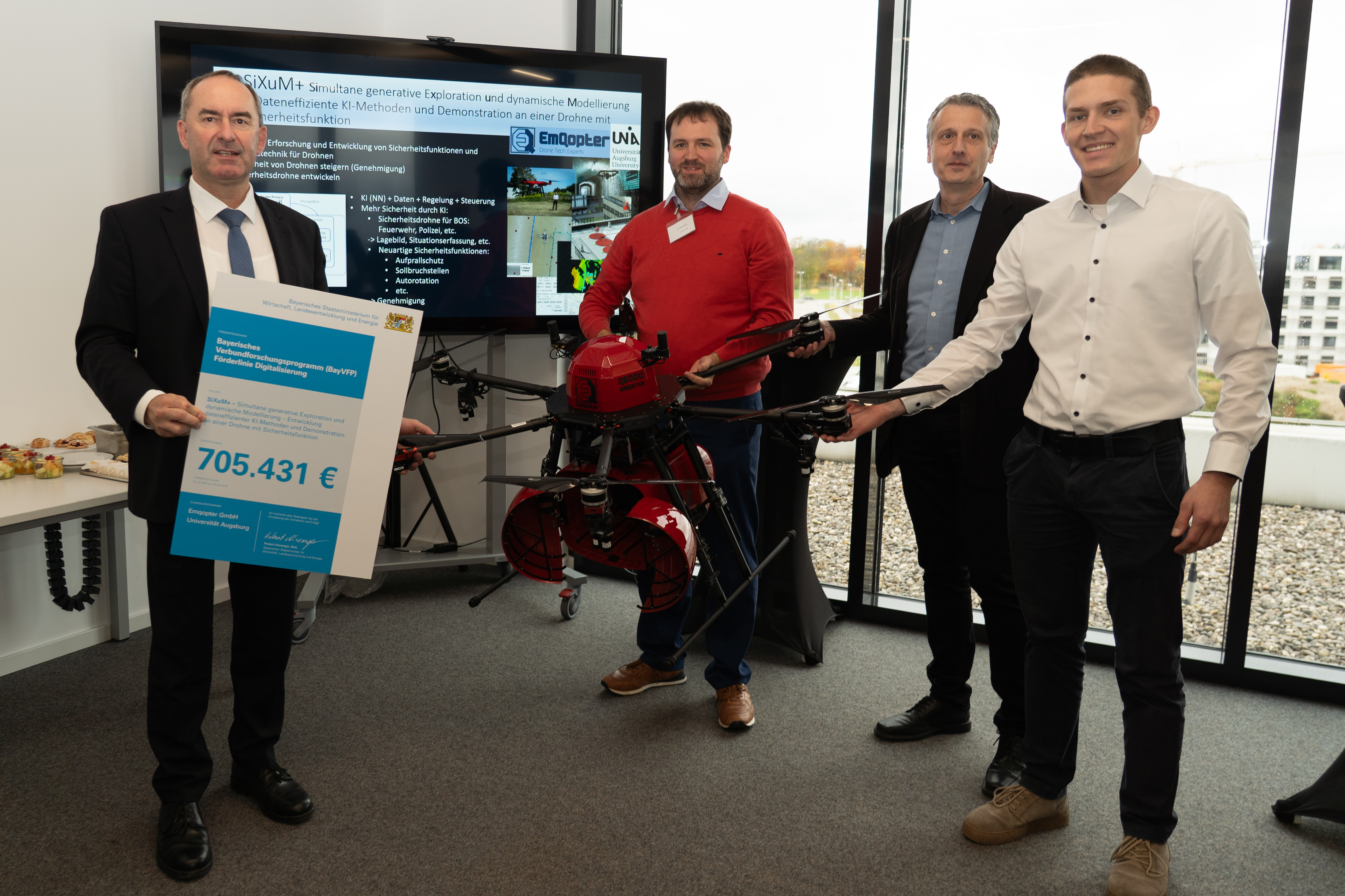 Das Projekt "SiXuM+" (Simultane generative Exploration und dynamische Modellierung – Dateneffiziente KI-Methoden und Demonstration an einer Drohne mit Sicherheitsfunktion) ist auf drei Jahre angelegt und wird vom Freistaat Bayern gefördert. Der bayerische Wirtschaftsminister Hubert Aiwanger übergab den Förderbescheid im Rahmen des „Runden Tischs Drohnenbetrieb Bayern“ in Oberpfaffenhofen an die beteiligten Projektpartner.