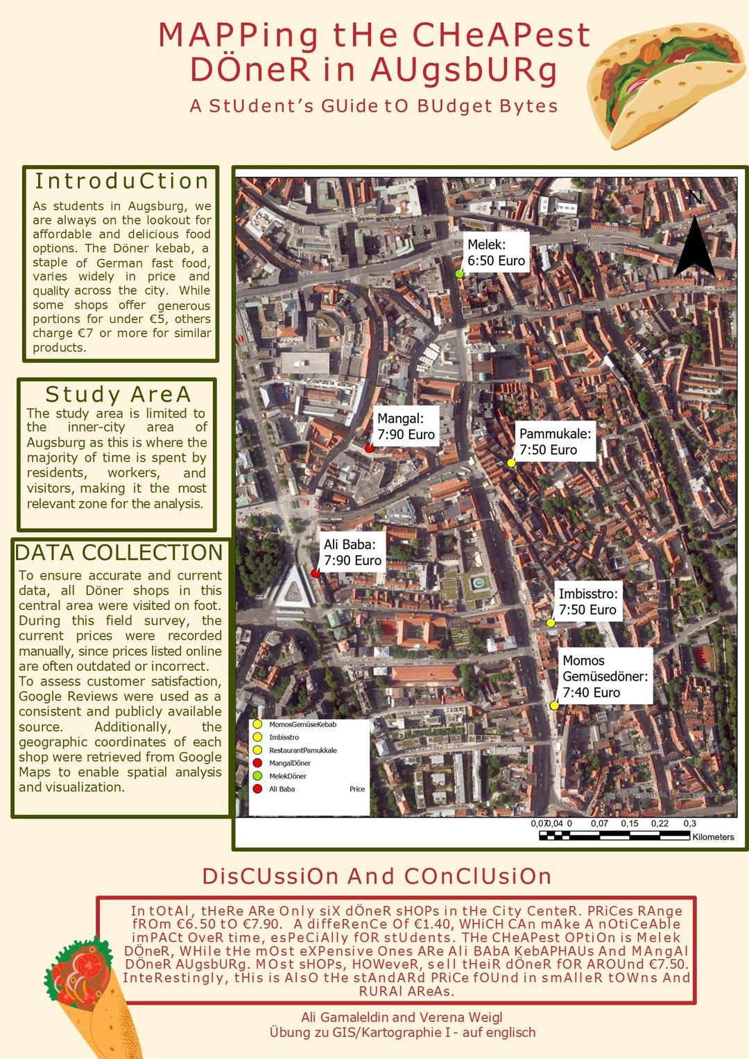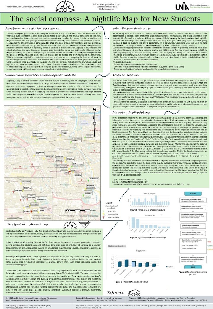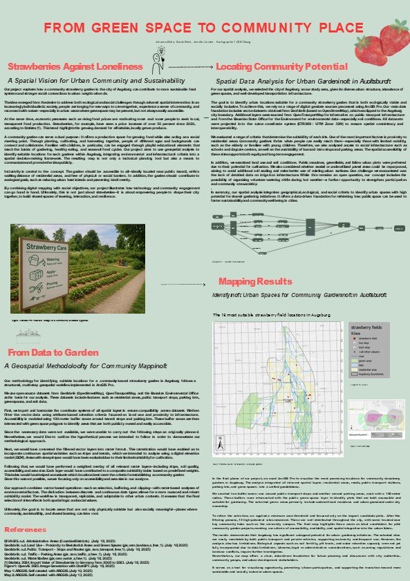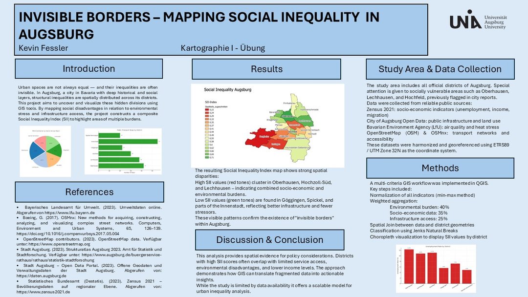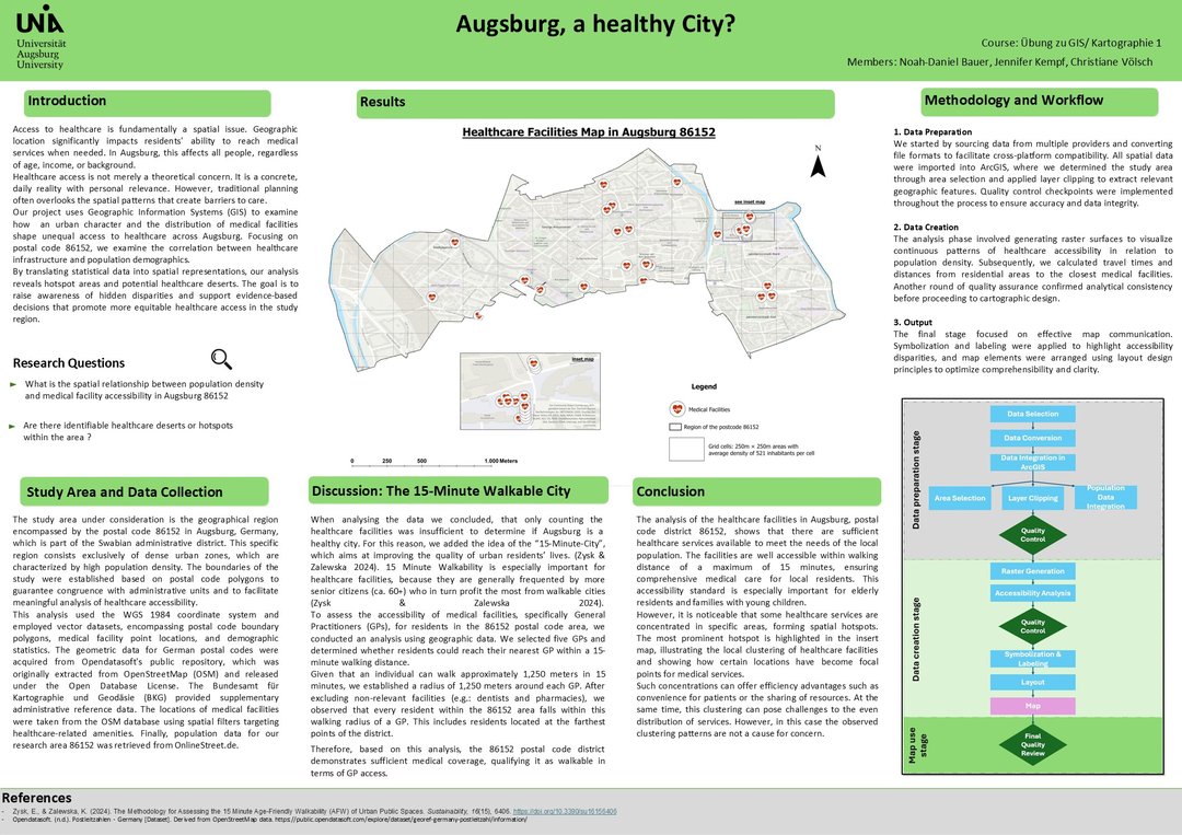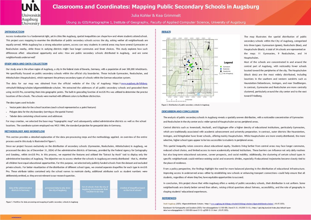 To prepare students for this course, we organized a structured project aimed at developing their first academic poster using GIS and cartographic data. The class was designed to combine methodological guidance with individual creativity. Each student selected a topic of personal or academic interest and was encouraged to clearly define the relevance of the issue, the problem they aimed to address, the types of spatial data involved, and the GIS techniques and cartographic methods they would apply. The final outputs included a visual research poster accompanied by a brief summary of conclusions and insights.