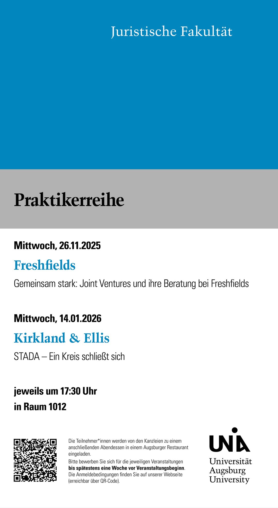 praktikerreihe@jura.uni-augsburg.de bewerben. Bitte versehen Sie die Dateibezeichnungen mit Ihrem Namen nach dem Format Nachname_Vorname_Dokument und geben Sie an, an welchen Veranstaltungen Sie teilnehmen möchten. Beachten Sie bitte unsere