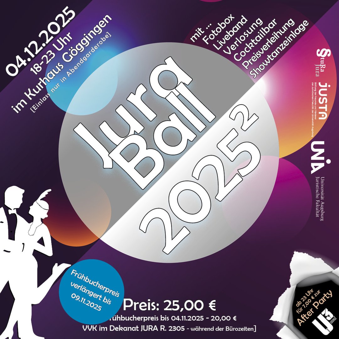 Wie in der Vergangenheit soll der Ball für Studierende, Absolventinnen und Absolventen, Mitarbeiterinnen und Mitarbeiter sowie den Augsburger Juristen die Möglichkeit geben in ungezwungener Atmosphäre zu feiern. Der Abend wird zum Begegnungsort in besonderer Umgebung mit vielen Möglichkeiten des Austauschs.