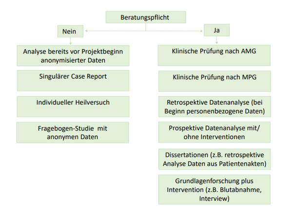 Die Ethikkommission ist für alle forschenden Mitarbeitenden der Universitätsmedizin Augsburg (UKA, Medizinische Fakultät, BKH Augsburg, Hessing, etc.) zuständig. Anhängendes Schaubild hilft bei der Prüfung, ob eine Beratungspflicht vorliegt. Bei Unsicherheiten empfehlen wir Ihnen, die Vorsitzenden der Ethikkommission zu kontaktieren.