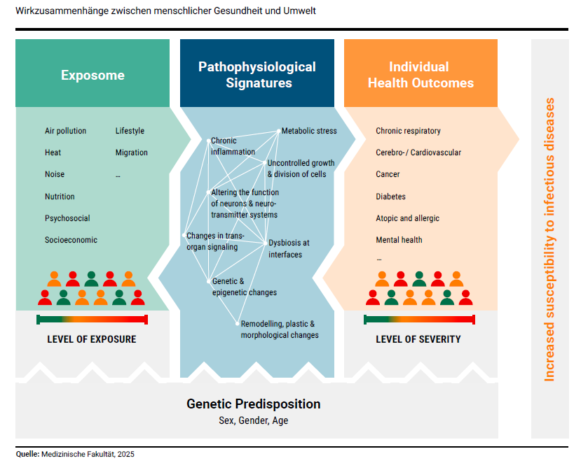 Expositionsforschung charakterisiert physikalische, chemische und biologische Umweltfaktoren. Durch Messung, Modellierung und Abschätzung wird die raumzeitliche Variabilität dieser Faktoren bestimmt. Am EHSI liegt ein deutlicher Schwerpunkt des Instituts auf atmosphärischen Umweltfaktoren und hier vornehmlich auf den Faktoren thermische Belastung und Luftschadstoffe wie Feinstaub und Ozon. Darüber hinaus wird auch Ernährung als zentrale Expositionsgröße betrachtet, insbesondere im Zusammenspiel mit Umweltfaktoren und individuellen Lebensstilmerkmalen. Ein weiterer Fokus liegt auf der Untersuchung sozioökonomischer Determinanten und Fragen der Ungleichheit im Kontext umweltbeeinflusster Gesundheit und Krankheit.