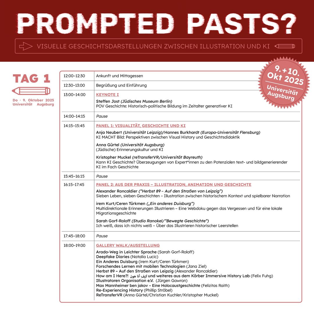 Die interdisziplinäre und praxisbezogene Tagung “Prompted Pasts? Visuelle Geschichtsdarstellungen zwischen Illustration und KI” möchte Forschende und Kreativschaffende aus dem historischen Bereich zusammenbringen, um über Einfluss und Auswirkungen von kreativer illustrativer Gestaltung sowie generativer Bild-KI auf die Darstellung, Wahrnehmung und Vermittlung von Geschichte zu diskutieren. Die Veranstaltung findet am 9.–10. Oktober 2025 an der Universität Augsburg statt. Eine hybride Teilnahme ist möglich.