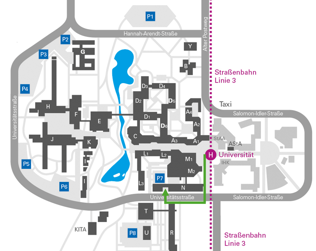 - Arriving at the main station of Augsburg, you take the tram line 3 in the direction „Haunstetten West“ or "Königsbrunn" until the stop „Universität“.