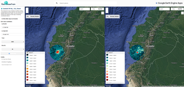Air quality monitoring is essential for understanding population exposure to pollution, yet many cities—especially in the Global South—do not have complete or continuous Air Quality Monitoring Networks (AQMN). To support scientists, students, journalists, and decision-makers, we developed an interactive web application that allows users to visualize monthly median concentrations of NO₂ and SO₂ anywhere in the world. The application is freely available at The Sentinel-5P Coordinate Explorer is an open-access web application built on the Google Earth Engine (GEE) platform to democratize access to satellite-based atmospheric information. Developed by Dr. César Iván Álvarez (University of Augsburg, Germany), the tool focuses on transforming the Sentinel-5P TROPOMI dataset into an intuitive and fast visualization environment. - Purpose The goal of the application is to help researchers, environmental practitioners, students, and the public quickly understand air pollution patterns—especially in cities where no ground stations exist. - Data and Functionality The application uses the ESA Sentinel-5P TROPOMI instrument (2018–2025) to compute monthly medians for key atmospheric pollutants: Users can: - Click on any point on the world map to retrieve pollution values. - Enter latitude and longitude manually. - Select year and month to visualize pollution over time. - Generate dynamic visualizations directly in the browser. Behind the scenes, the application uses GEE to perform spatial queries, temporal aggregation, and optimized visualization for fast rendering—even at global scale. The tool promotes: - Accessibility: runs in any browser, no GIS skills needed - Reproducibility: based entirely on public Sentinel-5P data - Transparency: users can inspect the underlying GEE script - Scalability: designed for global use Citation: Álvarez, C. I. (2025). Sentinel-5P Coordinate Explorer: A Web Application for Accessing Monthly Median NO₂ and SO₂ Concentrations Using Google Earth Engine. University of Augsburg. Available online: https://cesarivanalvarezmendoza.users.earthengine.app/view/sentinel5pcoordinate