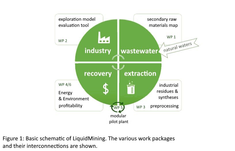 The LiquidMining project, funded by the German Federal Ministry for Economic Affairs and Energy (BMWE) within the framework of the 8th Energy Research Programme, focuses on the recovery of critical metals from industrial and natural waters. Within the project, metal-bearing waters are systematically analyzed, a secondary raw materials map is developed, and economic potentials are assessed. In parallel, various extraction and processing technologies are developed and evaluated and, together with industrial partners, scaled up to pilot-plant level. Subsequently, a modular pilot facility is constructed to enable practice-oriented demonstration. The overall objective is to comprehensively exploit the ecological and economic potential of raw material recovery from metal-containing waters, thereby supporting a sustainable, circular-oriented raw materials strategy for Germany and Europe.